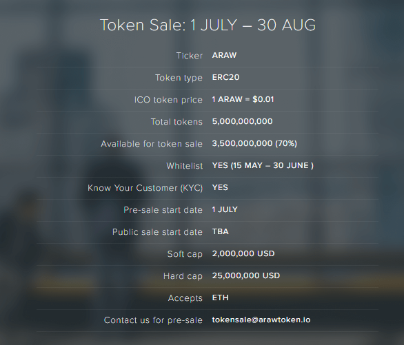 The price of one coin system (ARAW) during sales is $ 0.01. In total, the system conceived 5 billion tokens, of which 3.5 billion will be sold. Tokens are sold for ETH. Soft cap project - $ 2 million. Hard-cap project - $ 25 million. The project is registered in the UK and is banned in the United States.