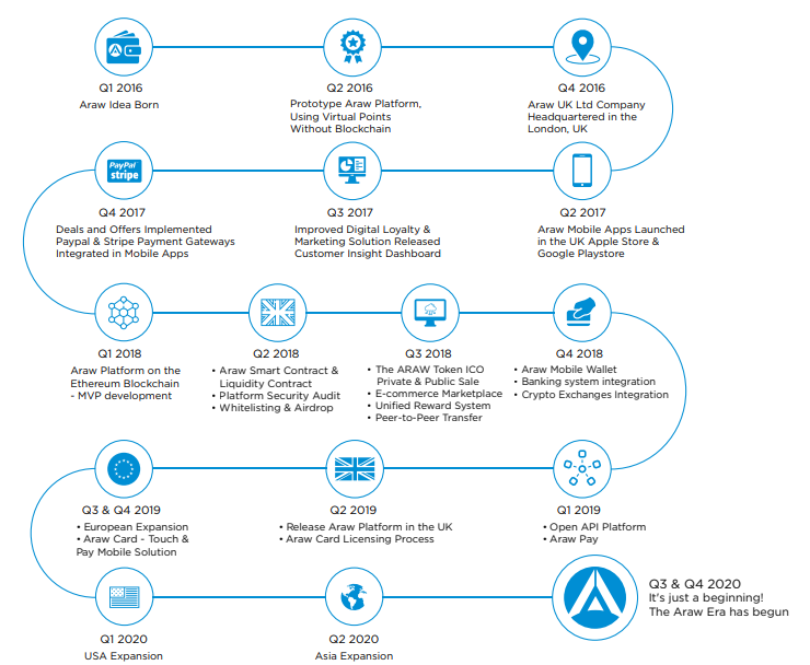 The events of the map have been developing since 2016, when the idea of the project arose. In the same year, a prototype platform was created and a headquarters was opened in London. The following year the application was launched in the Apple Store and Google Play. Also in 2017, a marketing solution was issued, a number of unique technologies were developed and implemented. At the beginning of this year, the team began to develop the MVP of its detachment. Also, in 2018, an audit of platform security was planned, carrying out Airdrop. In the near future, a mobile wallet will become available, with the platform fully integrated with the banking system. In 2019, the team has big plans for popularization within Europe (primarily in the UK), and in 2020 the project intends to conduct an active marketing campaign in Asia and the US.