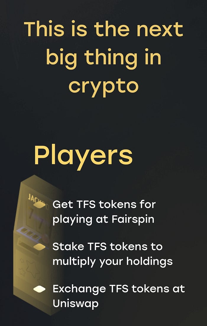 The value of the TFS token is expected to grow once listed at Uniswap. TFS is a deflationary token with a regular buyback and a limited total supply stable circulation and demand ensured by the Fairspin platform with over 13,000 active users. To continue playing at Fairspin Stake, mine TFS tokens. To multiply TFS tokens, use the trueStake option. Uniswap allows you to withdraw, buy, and sell TFS tokens.